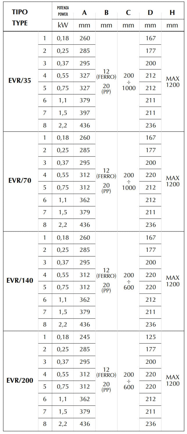 • Girante quadripala con pale inclinate o diritte in acciaio AISI 304-316 o in PP, PVC, PVDF o PE-HD