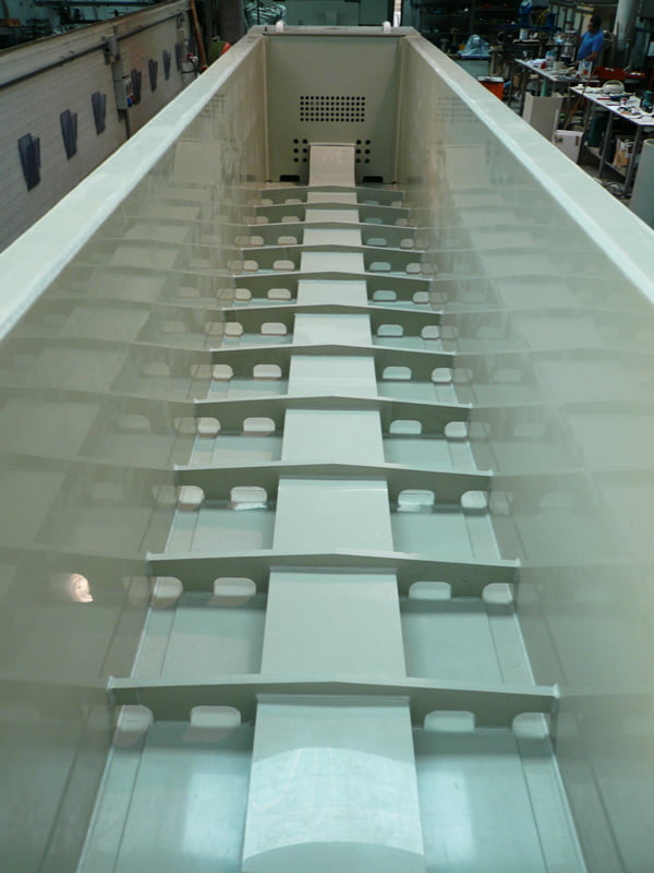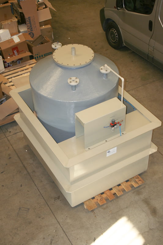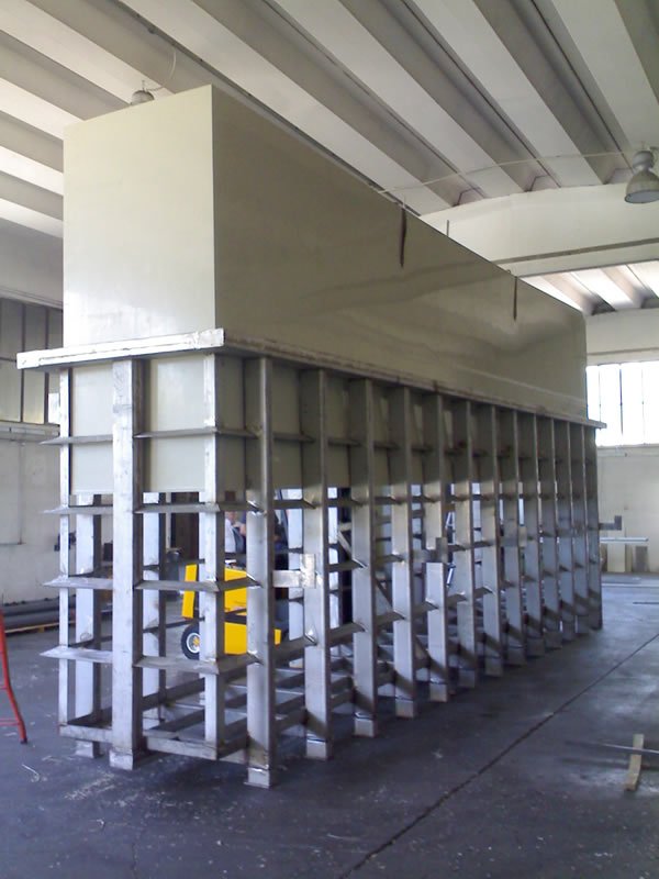 Nuova Darimpianti produce vasche in polipropilene rinforzate con strutture in acciaio di grandi capacità, particolarmente adatte al contenimento di sostanze liquide molto corrosive.
